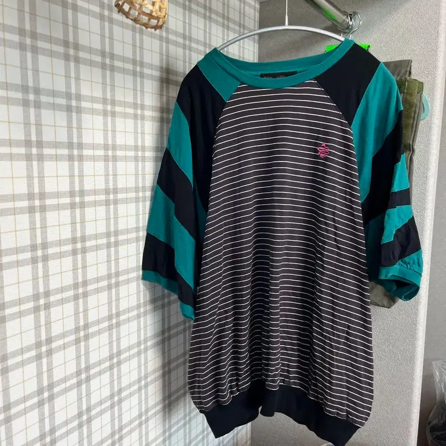 블랙과 터콰이즈의 스트라이프 디자인, 느긋한 돌먼 실루엣의 티셔츠. 양쪽 사이드 포켓 부착 시착만 한 상품 - 브랜드: aldies - 색상: 블랙/터콰이즈 - 디자인: 스트라이프/래글런 슬리브 - 스타일: 넉넉한 실루엣 - 자수: 작은 로고 자수 가슴둘레…약 60cm 이상 총길이…약 67cm