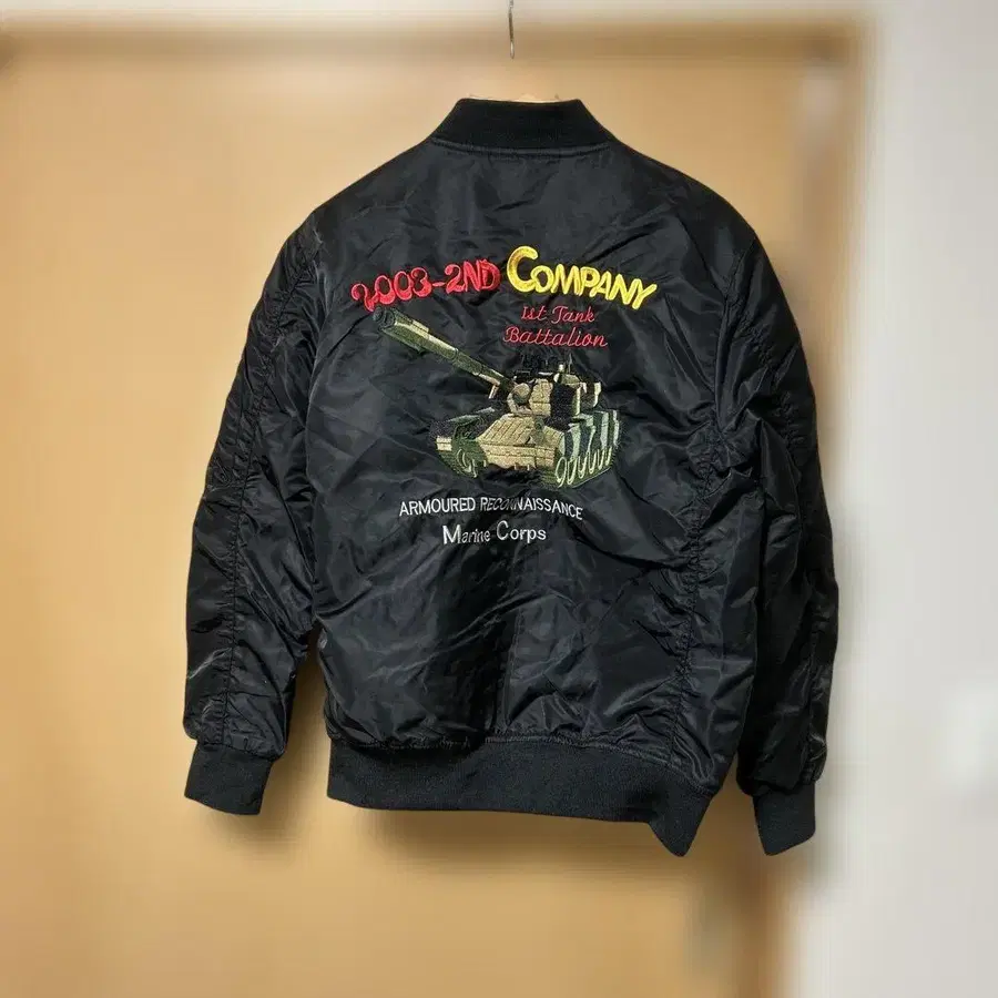 자수 디자인의 MA-1 자켓, 오렌지 안감, 패치 부착.