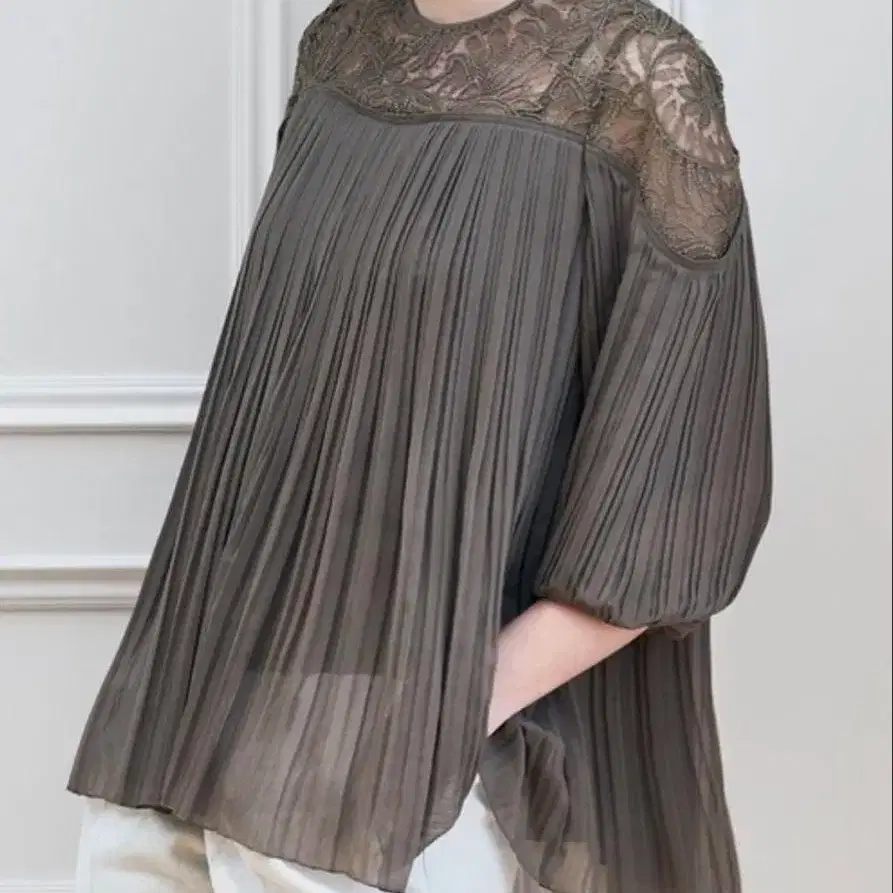가슴 위에는 리프 무늬 레이스, 가슴 아래에는 양류 쉬폰을 조합한 화려한 블라우스입니다. 쉬폰에 섬세한 플리츠를 넣고, 밑단에서 사라지도록 마감한 테크닉에 신경을 쓴 블라우스. 에어리한 분위기의 블라우스는 심플한 하의와 함께 매치하는 것을 추천합니다. 볼륨 슬리브와 목 뒤의 리본 타이가 포인트입니다.