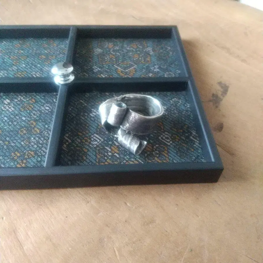 한 장의 실버 판을 구부려 디자인한 반지입니다. 임팩트가 있어 캐주얼한 복장에 잘 어울릴 것 같습니다. 안쪽의 원은 약 1.7cm입니다.
