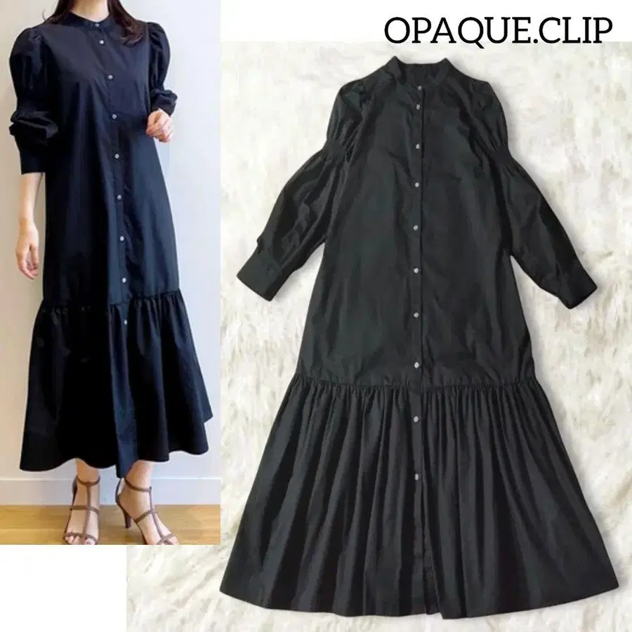 오파크 도트 클립 셔츠 원피스 롱 블랙 밴드 카라 긴팔