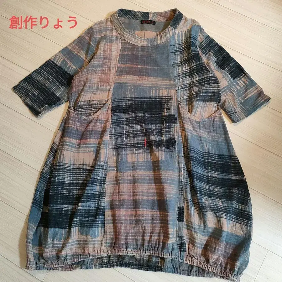 소라기 멀티 컬러 체크 무늬 튜닉 반팔