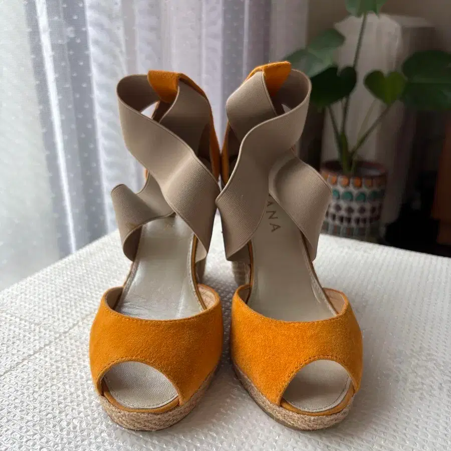 DIANA 오렌지 스웨이드 웨지 힐 샌들
