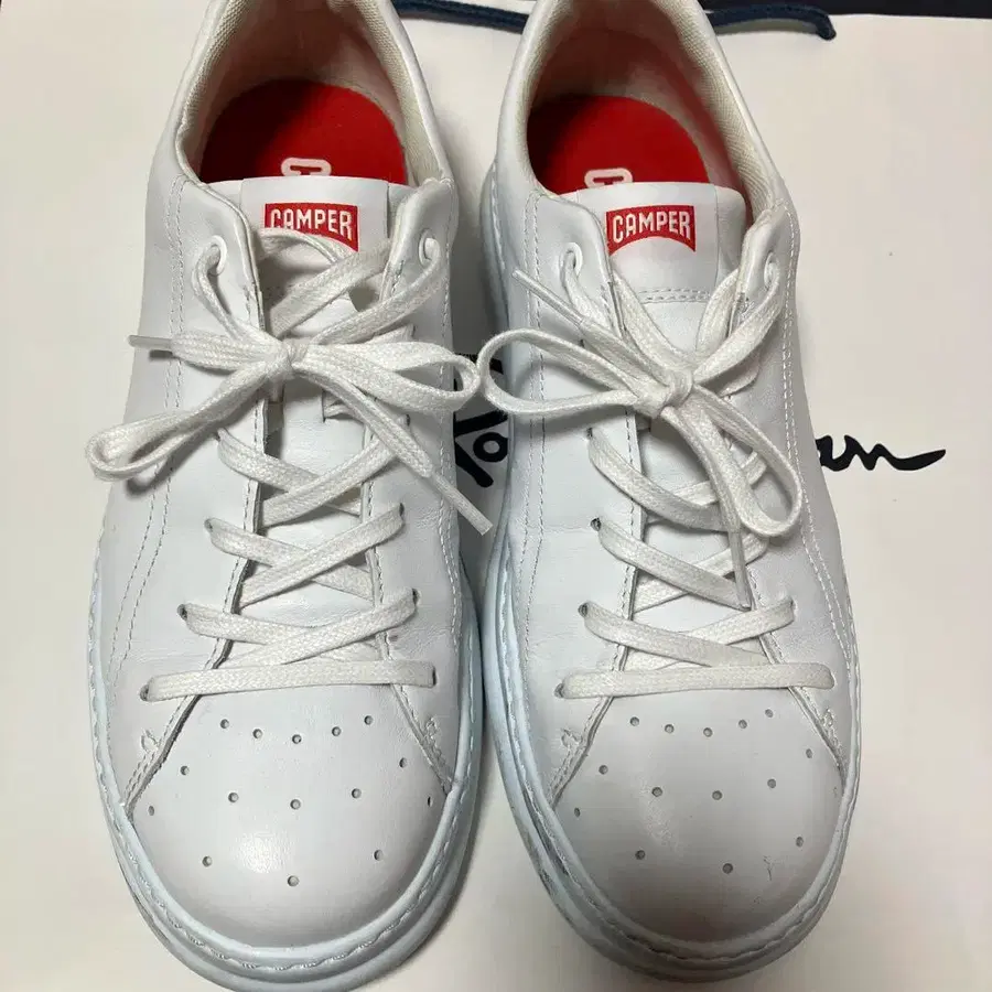 화이트 가죽 로우 컷 스니커즈, 레드 인솔이 특징입니다. - 브랜드: 캠퍼 - 색상: 화이트 - 인솔 색상: 레드 - 디자인: 로우 컷 - 소재: 가죽 - 밑창 색상: 화이트 방문해 주셔서 감사합니다.
