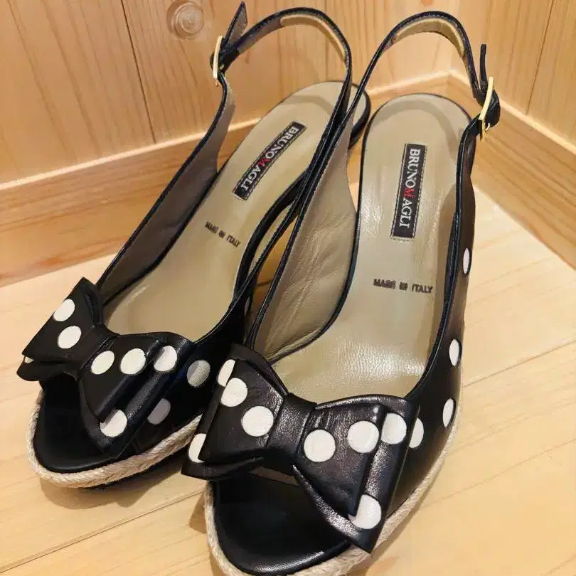 도트와 리본이 귀여운 샌들입니다. 바닥에 약간의 흠집이 있지만 비교적 깨끗한 상태입니다. 사이즈…35 1/2 약 22.5cm 힐 높이…약 9.5cm 상자가 없으므로 대체 상자로 발송합니다. #블루노마리 #BRUNOMAGLI #여성용 샌들