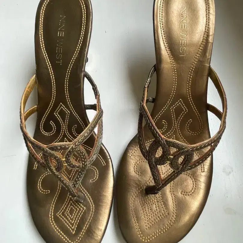장식 스트랩이 특징인 골드 플립플랍. - 브랜드: Nine West - 색상: 골드 - 스타일: 플립플랍 - 힐 높이: 중간 힐 - 디자인: 장식 스트랩 ※몇 번 착용한 중고품으로, 자택에서 보관하던 상품입니다. 이 점 양해 부탁드립니다. ※에코 메루카리 택배로 배송될 수 있습니다. 양해 부탁드립니다.