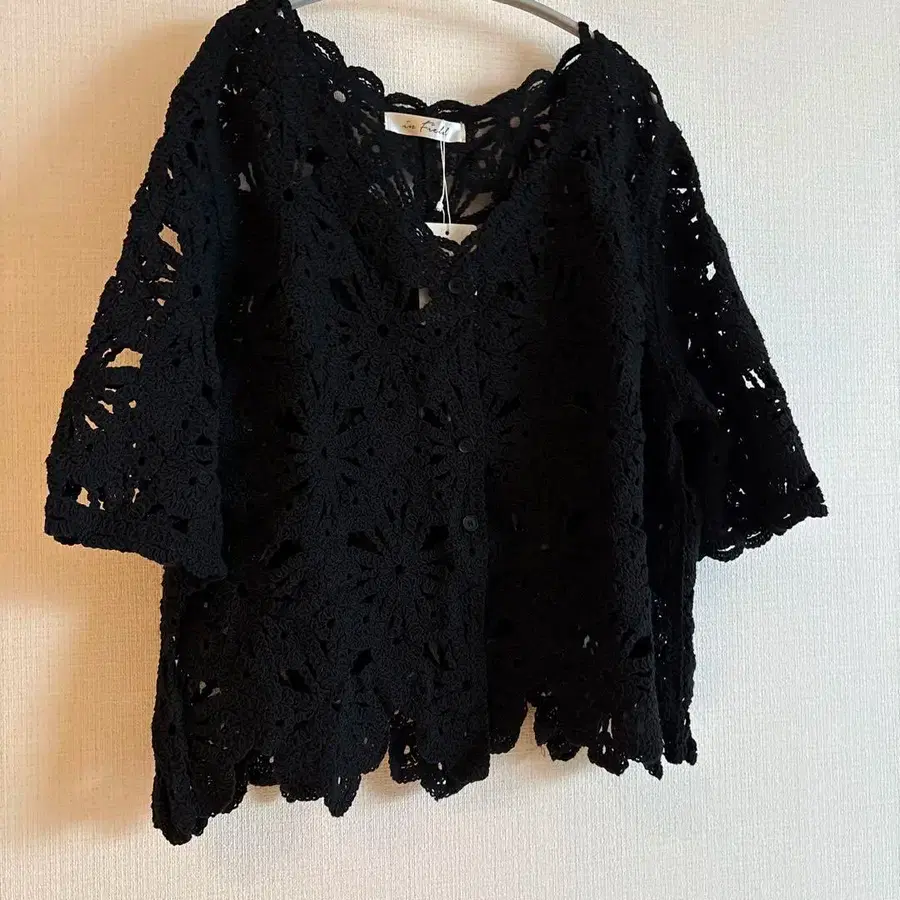 고급스러운 레이스 니트가 특징인 블랙 가디건. 앞뒤로 입을 수 있습니다. - 컬러: 블랙 - 소재: 레이스 니트 - 디자인: V넥, 버튼 - 소매 길이: 7부 소매 - 특징: 전체 레이스 니트 방문해 주셔서 감사합니다.