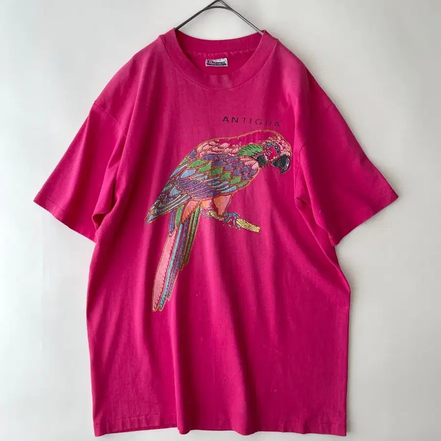 1980년대 헤인즈의 애니멀 프린트 T셔츠. 선명한 핑크 네온 컬러에 멀티 컬러 잉꼬 프린트가 매우 캐치한 디자인입니다.