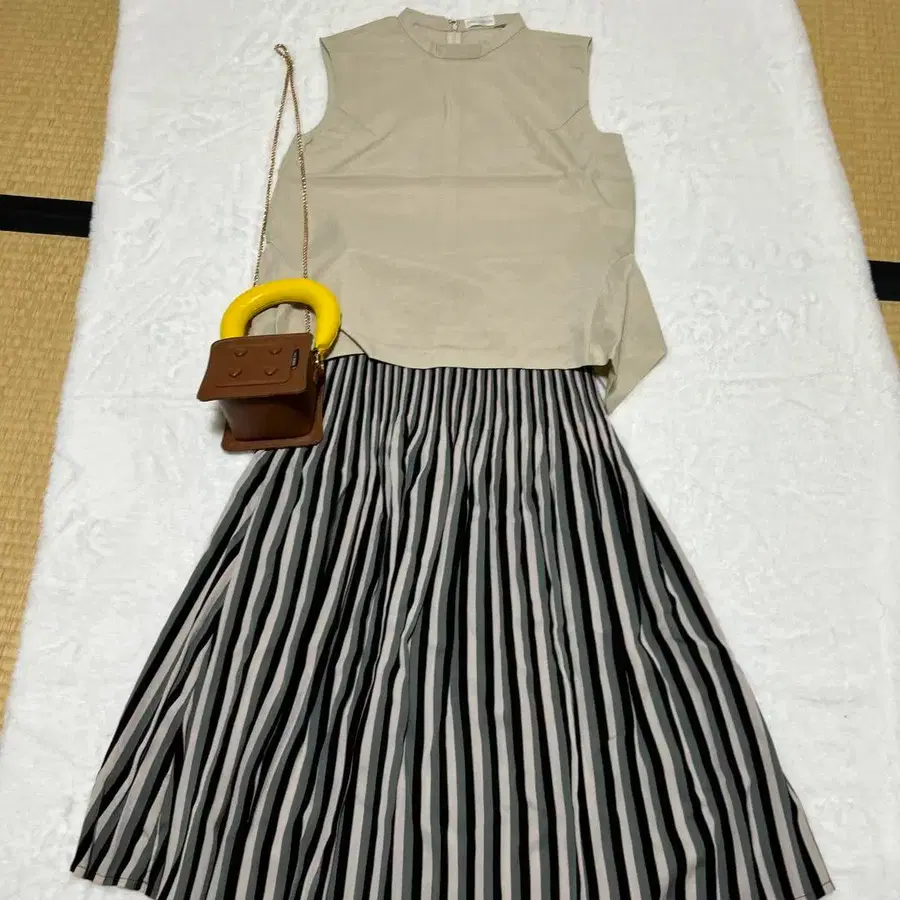 베이지색상의와 스트라이프 플리츠 스커트 세트. 상의 색상: 베이지 스커트 색상: 스트라이프(블랙, 그레이, 베이지) 백 색상: 브라운 백 디자인: 체인 스트랩 스커트 디자인: 플리츠 스커트 방문해 주셔서 감사합니다.