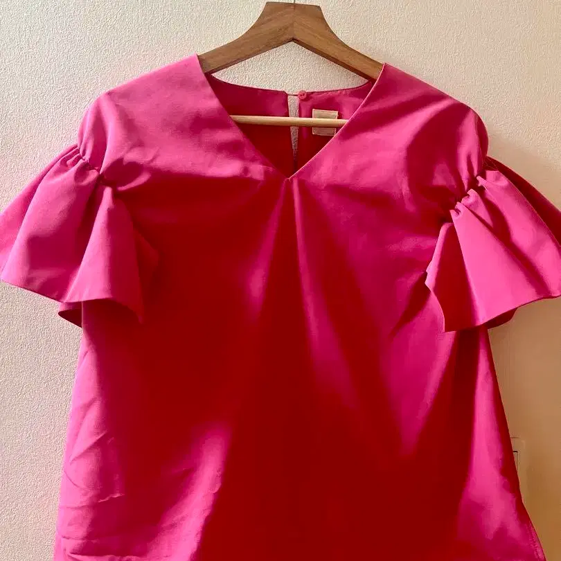 쓰리 스퀘어 핑크 V넥 프릴 소매 상의