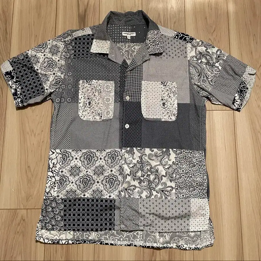 패치워크 스타일의 디자인이 특징인 반팔 셔츠로, 네이비와 화이트의 대비가 돋보입니다. - 브랜드: ENGINEERED GARMENTS - 사이즈: S 어깨 너비 약 44cm, 가슴 너비 약 52cm 소매 길이 약 22.5cm      기장(칼라 아래부터 밑단까지) 약 71cm     개인 측정으로 약간의 오차가 있을 수 있습니다. - 소재: 코튼 100% - 생산국: 미국 - 디자인: 패치워크풍 디자인      오픈 카라      소매 끝과 밑단에는 슬릿이 있습니다 - 컬러: 네이비&화이트 - 상태: 특히 눈에 띄는 얼룩이나 풀림은 없습니다 - 얇고 매끄러운 원단입니다 판매자: 비흡연자, 반려동물은 기르지 않습니다 궁금한 점이 있으시면 언제든지 문의해 주세요 방문해 주셔서 감사합니다