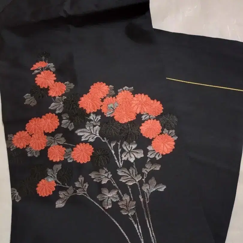 검은색 바탕에 오렌지색과 검은색 꽃무늬 자수가 수놓아진 나고야 오비입니다.