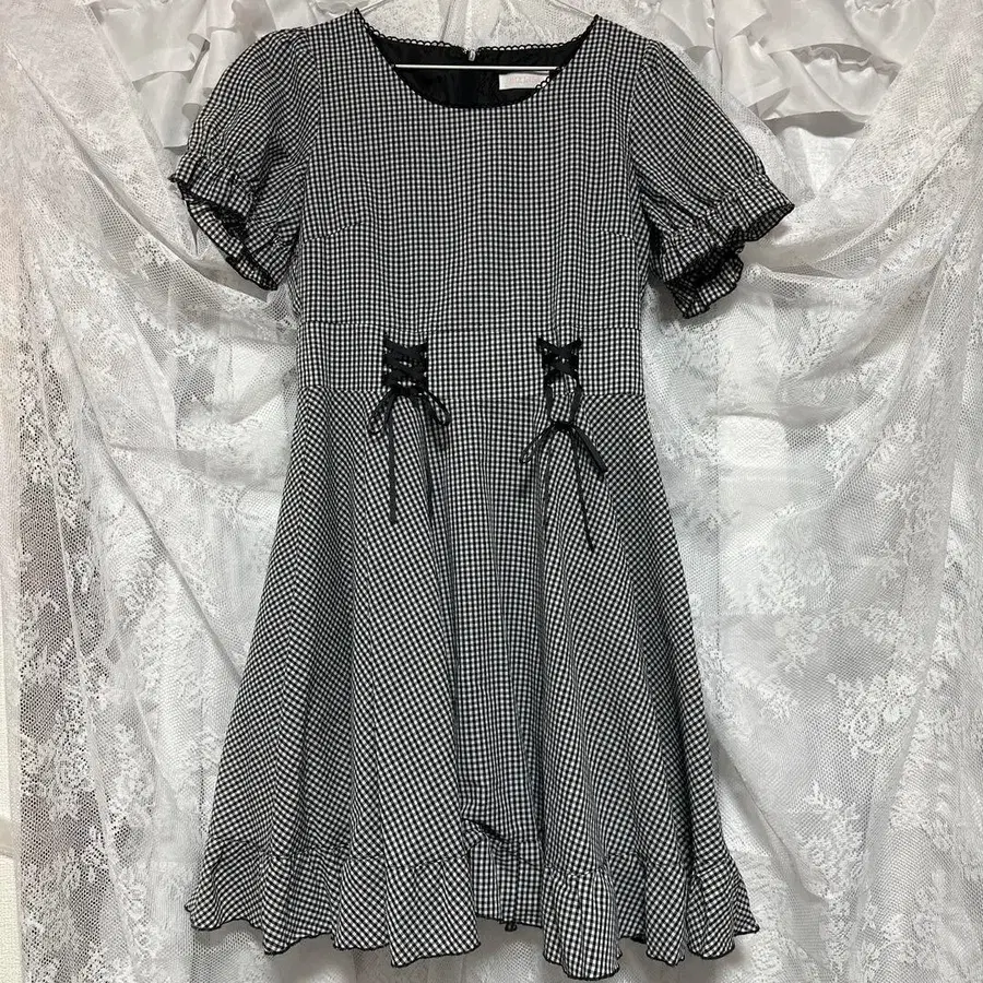 블랙과 화이트의 깅엄 체크 프릴이 특징인 미니 원피스, 리본 디테일이 돋보입니다. - 색상: 블랙과 화이트 깅엄 체크 - 디자인: 프릴이 있는 미니 원피스 - 소매 스타일: 반팔 - 장식: 리본 디테일 방문해 주셔서 감사합니다. 사진과 같이 약간의 일광화상 자국이 있습니다. 아마추어 보관으로 신경 쓰시는 분은 구매를 삼가 주시기 바랍니다.
