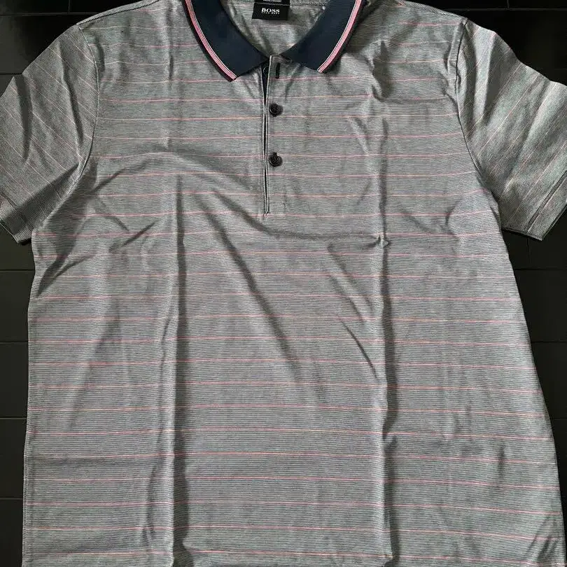 스트라이프 디자인의 그레이와 네이비 색상 피케 셔츠. 개인적으로 촉감이 매우 좋습니다. 골프웨어로 착용 가능합니다. - 브랜드: BOSS - 색상: 그레이/네이비 - 디자인: 스트라이프 - 스타일: 피케 셔츠 - 옷깃 디자인: 버튼 다운 - 버튼 개수: 3