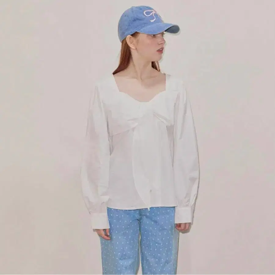 ronron 화이트 V넥 볼륨 슬리브 셔츠