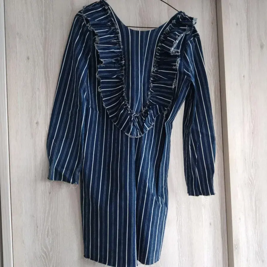 스트라이프 디자인의 프릴이 달린 V넥 원피스, 캐주얼한 데님 스타일의 원단. - 색상: 스트라이프 - 디자인: 프릴이 달린 V넥 - 소매 길이: 긴 소매 - 소재: 데님 스타일의 원단 - 스타일: 캐주얼 #자라#데님#원피스#스트라이프