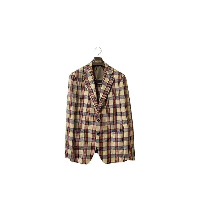 딸리아또레의 베이지와 빨간색 체크 무늬 테일러드 자켓, 2개의 버튼과 노치드 라펠 디자인. - 색상: 체크 무늬 (베이지, 레드, 블루) - 디자인: 테일러드 자켓 - 포켓: 앞면에 2개의 포켓 - 버튼: 2개의 버튼 - 뒷면 디자인: 심플한 뒷면 - 라펠: 노치드 라펠 가격 인하 가능
