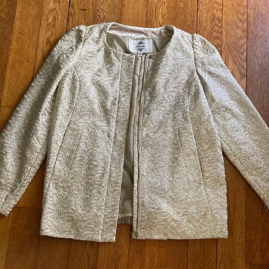 kaon 카온 자켓 원단은 골드빛이 도는 직물로 매우 고급스럽고 눈길을 끄는 자켓입니다. 뒷면은 쉬폰 소재로 되어 있습니다. 사이즈는 36입니다. 실측 사이즈는 약 어깨 너비 30 가슴 둘레 44 기장 55 소매 길이 55 정가 약 5만 엔