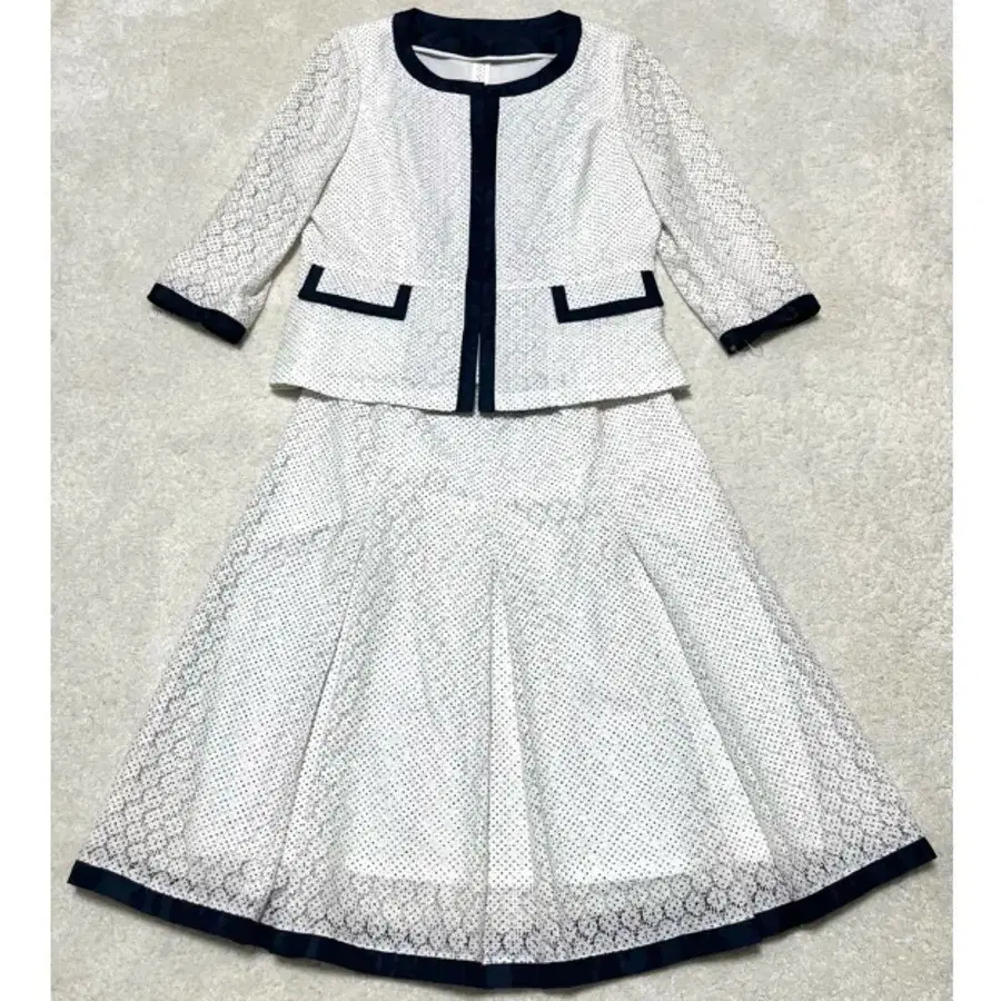 화이트와 네이비 컬러의 레이스 무늬가 특징인 스커트 세트. 포멀한 자리에도 캐주얼한 자리에도 잘 어울립니다. - 컬러: 화이트와 네이비 콤비네이션 - 스타일: 스커트 세트 정장 - 디자인: 레이스 무늬 자켓 - 소재: 가볍고 통기성이 좋은 원단 - 소매: 7부 소매 - 포켓: 앞면에 2개의 포켓(디자인 포켓으로 사용이 불가능합니다.) - 스커트 디자인: 플레어 스커트 방문해 주셔서 감사합니다. 여성용 세레모니 수트 셋업 2개 세트 전체 레이스 시원함 색상···화이트 계열 스커트 실루엣···플레어 계절···봄, 여름 오염, 찢김, 냄새 등···없음