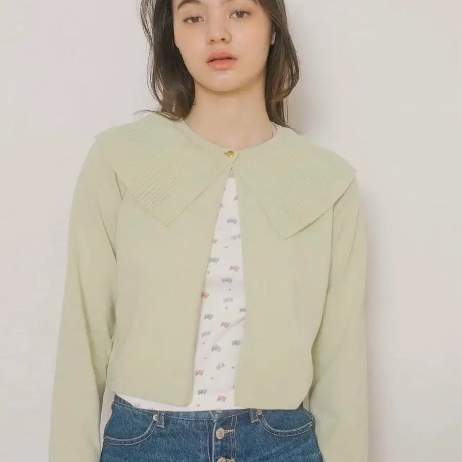 티나조준 tina:jojun 가디건 키미도리색 가디건입니다. 매장에서 7590엔에 구매했습니다. 목 부분에 골드 버튼이 하나 프릴이 달려 있어 귀엽습니다. 눈에 띄는 얼룩 등은 없습니다.