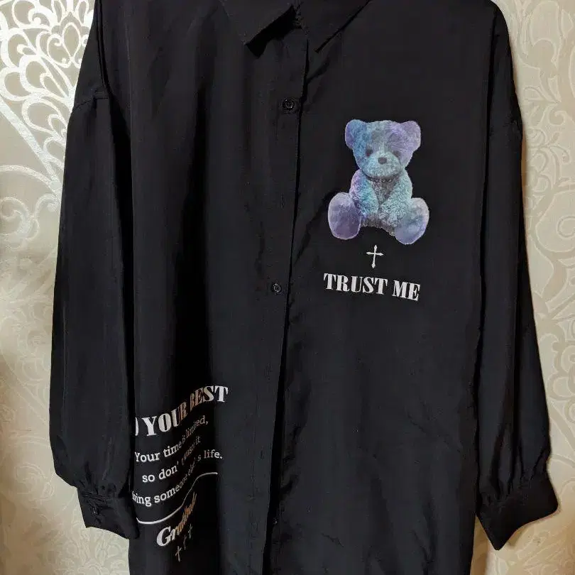 곰 프린트와 메시지가 특징적인 블랙 긴팔 셔츠. - 색상: 블랙 - 디자인: 곰과 메시지 프린트 - 스타일: 긴팔 셔츠 방문해 주셔서 감사합니다
