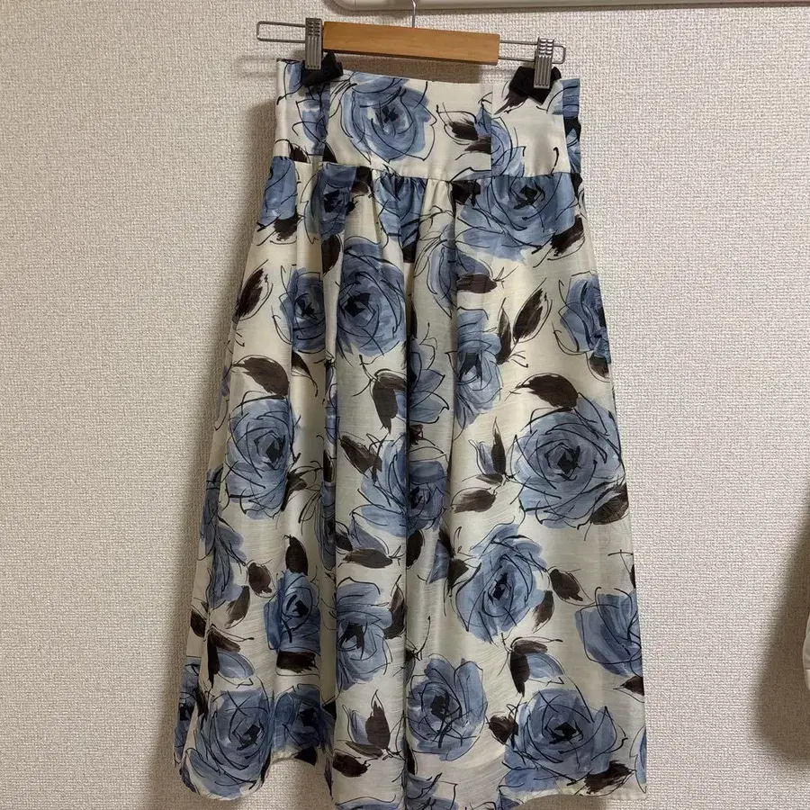 푸른 장미 무늬가 특징인 플레어 스커트. - 디자인: 푸른 장미 무늬 - 색상: 화이트/블루 - 스타일: 플레어 스커트 - 허리: 하이웨스트 방문해 주셔서 감사합니다. 사이즈는 2입니다. 상태는 깨끗하지만, 자택에서 보관하고 있는 상품이므로 양해 부탁드립니다.