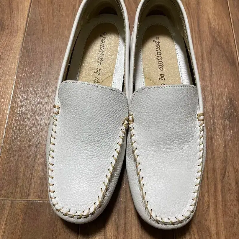 화이트 가죽에 스티치 디테일의 모카신. - 색상: 화이트 - 스타일: 모카신 - 소재: 가죽 - 디자인: 스티치 방문해 주셔서 감사합니다. 가죽의 깔끔한 모카신입니다. 팬츠에도 스커트에도 어울리는 심플한 디자인, 힐이 약 1cm로 직장이나 외출에도 좋습니다. 매장에서 신어 보았을 때는 딱 맞다고 생각했지만, 집에서 신어 보니 크고, 뒤꿈치에 패드를 넣어도 크기가 커서 24cm 정도인 분에게 추천합니다. 패드가 포함되어 배송됩니다. 색상...화이트 계열 오염, 찢김, 냄새 등...없음