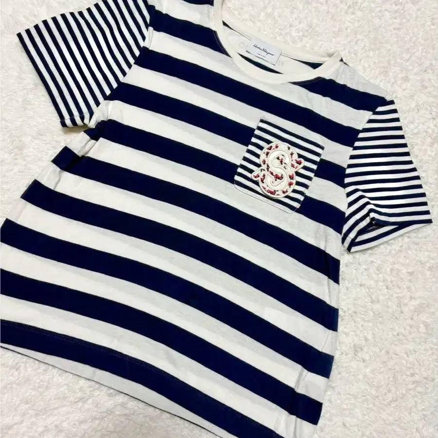 살바토레 페라가모의 티셔츠입니다. 가슴 부분에 간치니의 와펜과 소매와 얇은 보더의 절개 디자인이 귀엽습니다! 등에는 빨간색 로고가 쓰여 있습니다. 몇 번 사용했지만 눈에 띄는 얼룩이나 올풀림은 없으며 아직 사용하실 수 있습니다. 색상...화이트, 네이비