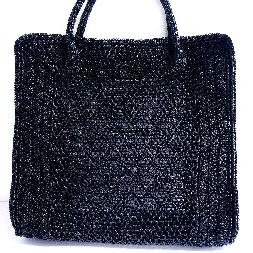 검은색 망사 토트백입니다. 사이즈 세로: 약 30cm. 가로 길이: 약 33cm. 바닥 폭: 약 9cm 단단한 실로 짜여져 있습니다. 입구에 금속 장식이 있습니다. 거의 사용감이 없는 좋은 상태입니다. 접어서 발송됩니다. 방문해 주셔서 감사합니다.
