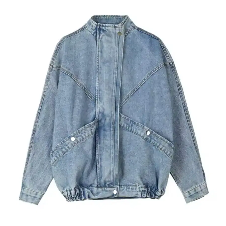 여성 데님 자켓 만다린 칼라 롱 슬리브 솔리드 루즈 특대형 자켓