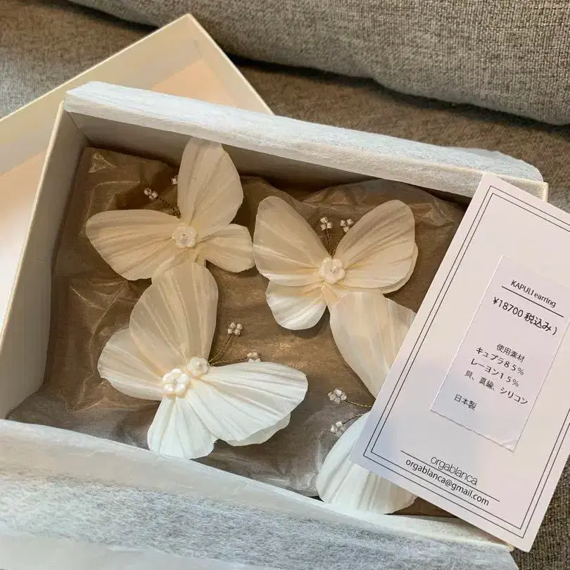 orgablanca 버터플라이 귀걸이입니다. 웨딩 때 사용했습니다. 저희가 두 번째 소유자입니다. 첫 번째 소유자가 사용한 파운데이션이 부착되어 있으므로 양해 부탁드립니다. 얼룩은 뒷면에만 있으므로 착용 시에는 신경 쓰이지 않았습니다.