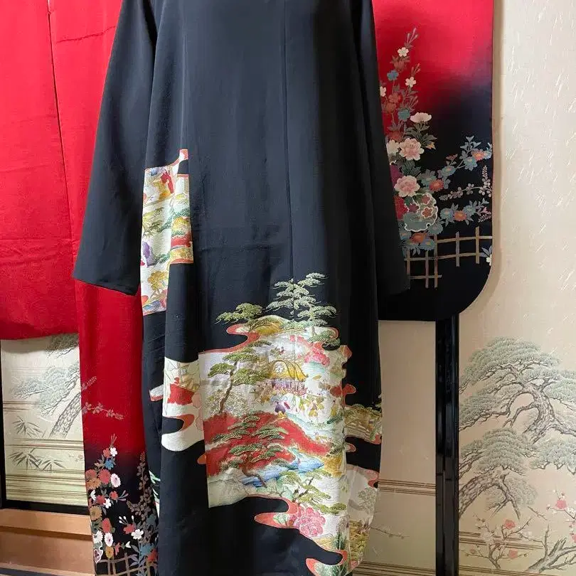 블랙 전통 예복 기모노 풍경 자수 리메이크