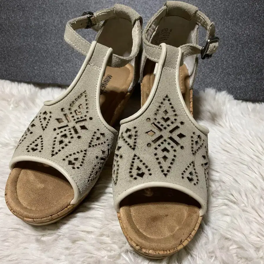 한 번 사용 후 상자에 넣어 보관했습니다. 웨지솔이라 발에 편한 샌들입니다. 스웨이드 어퍼에 네이티브 패턴 펀칭. 힐은 코르크로 가볍습니다.