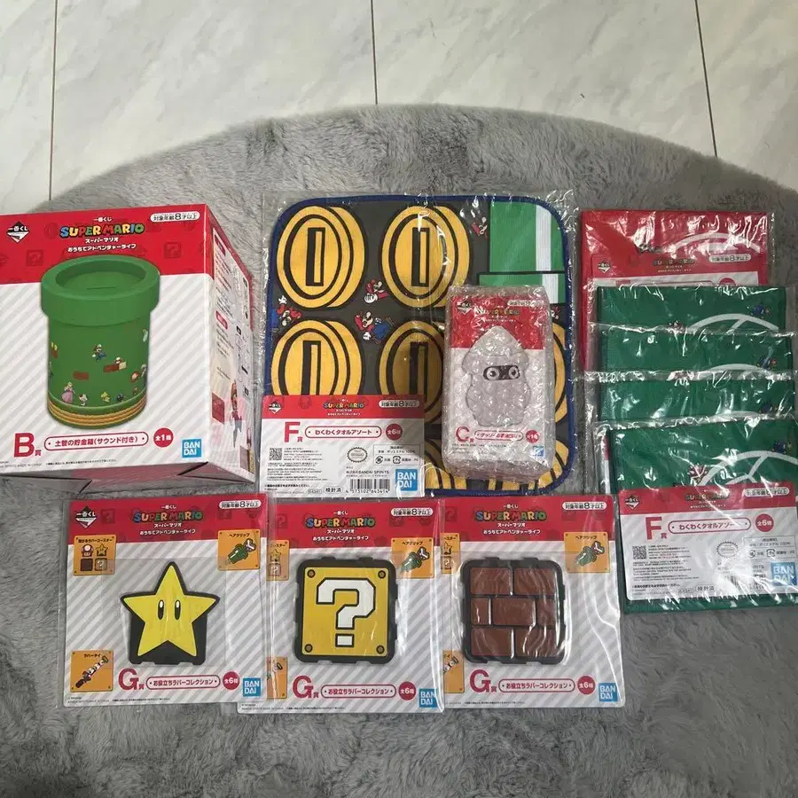 슈퍼 마리오 캐릭터 굿즈 세트 제일복권 - 세트 내용: 슈퍼 마리오 관련 상품 (타월, 매트, 피규어 등) - 브랜드: 반다이 - 캐릭터: 슈퍼 마리오 - 색상: 녹색, 빨간색, 파란색, 노란색 - 타월 수: 6장 - 오징어 간장통, 도칸 저금통 마리오의 제일복권에서 당첨된 상품이지만 한 번도 사용하지 않고 방에 놓여있었습니다. 2년 정도 전에 한 것 같습니다.