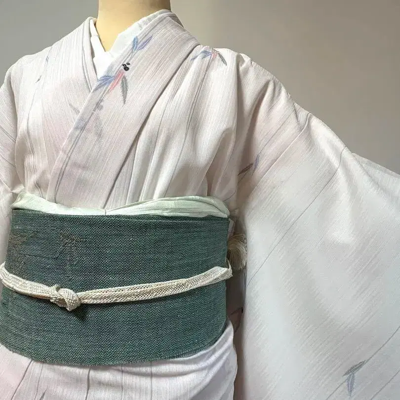 여름 오비 린넨 나고야 오비 청록색 핑 포인트 여름 풀 그림 360cm