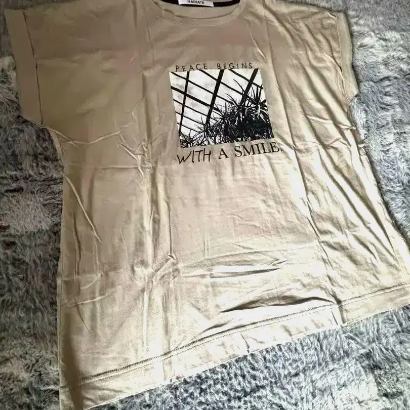 프린트 디자인이 있는 베이지 크루넥 티셔츠. - 브랜드: RADIATE - 디자인: 프린트 - 컬러: 베이지 - 스타일: 크루넥 - 메시지: PEACE BEGINS WITH A SMILE 방문해 주셔서 감사합니다.