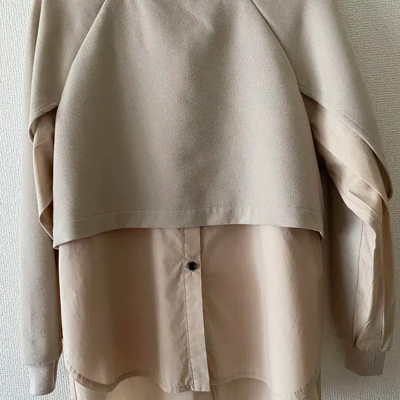 레이어드 디자인의 베이지 긴팔 셔츠 뒷면 벨트 포함 - 색상: 베이지 - 디자인: 레이어드 스타일 - 특징: 뒷면 리본 포함 - 소매 스타일: 긴 소매 사이즈 1 셔츠와 트레이닝복을 겹친 듯한 디자인 트레이닝복 디자인 부분은 얇습니다 ※오른쪽 뒷소매에 검은 잉크 얼룩이 있습니다. 신경 쓰시는 분은 구매를 삼가 주시기 바랍니다.