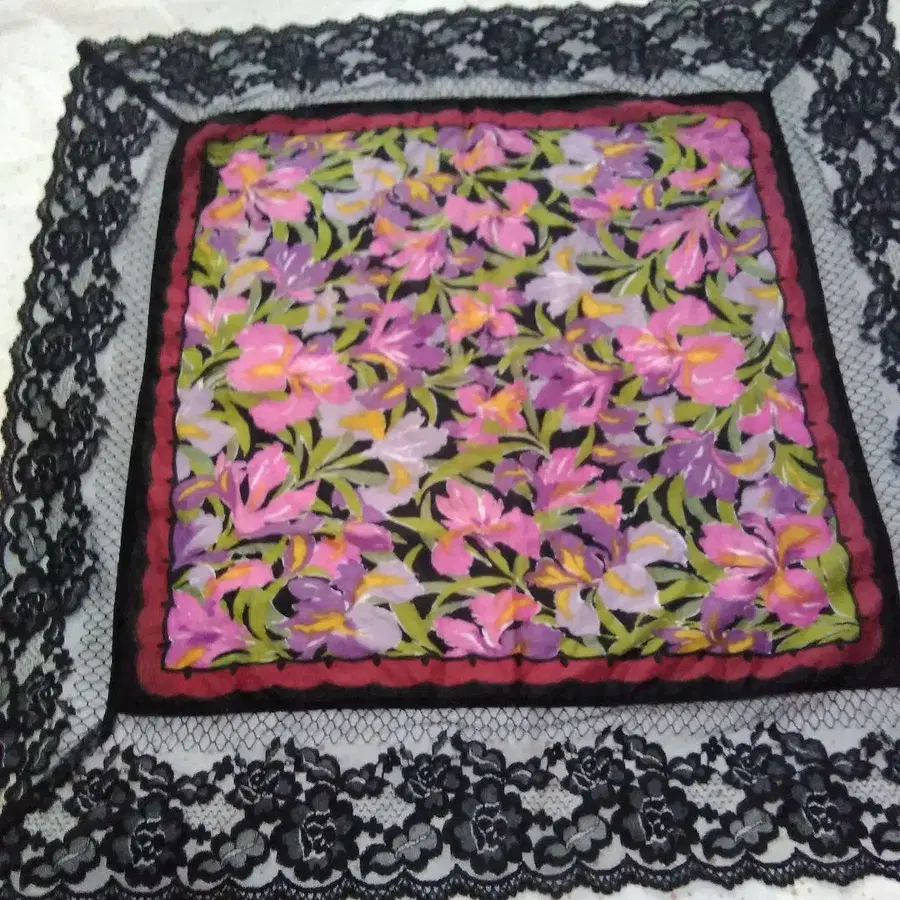 화려한 꽃 패턴과 레이스 엣지가 특징인 실크 스카프. - 브랜드: GHERARDINI - 색상: 보라색, 그린, 블랙 - 소재: 실크, 레이스 - 디자인: 꽃 패턴, 레이스 엣지 - 국가: 이탈리아 방문해 주셔서 감사합니다.