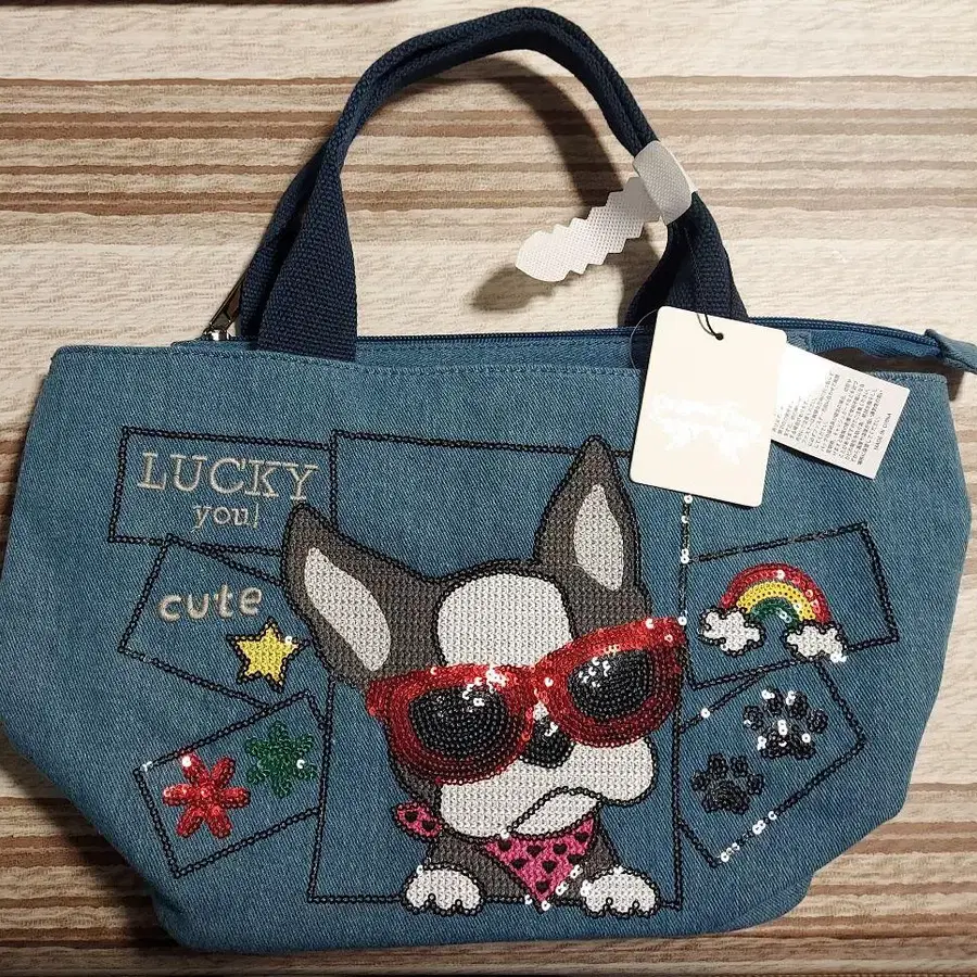 불독 자수와 스팽글이 특징인 데님 블루의 소형 핸드백. - 디자인: 불독 자수와 스팽글 장식 - 컬러: 데님 블루 - 내부: 빨간색 안감과 포켓 포함 - 사이즈: 소형 핸드백 - 특징: 패션성이 뛰어난 캐주얼한 디자인 개구부 지퍼 포켓 외부 지퍼 1 안쪽 지퍼 1 오픈 2 소재 외부 면 안쪽 폴리에스테르 사이즈 약 세로 22cm 가로 33cm 바닥 15.5cm A4 불가 무게 약 270g 중국산