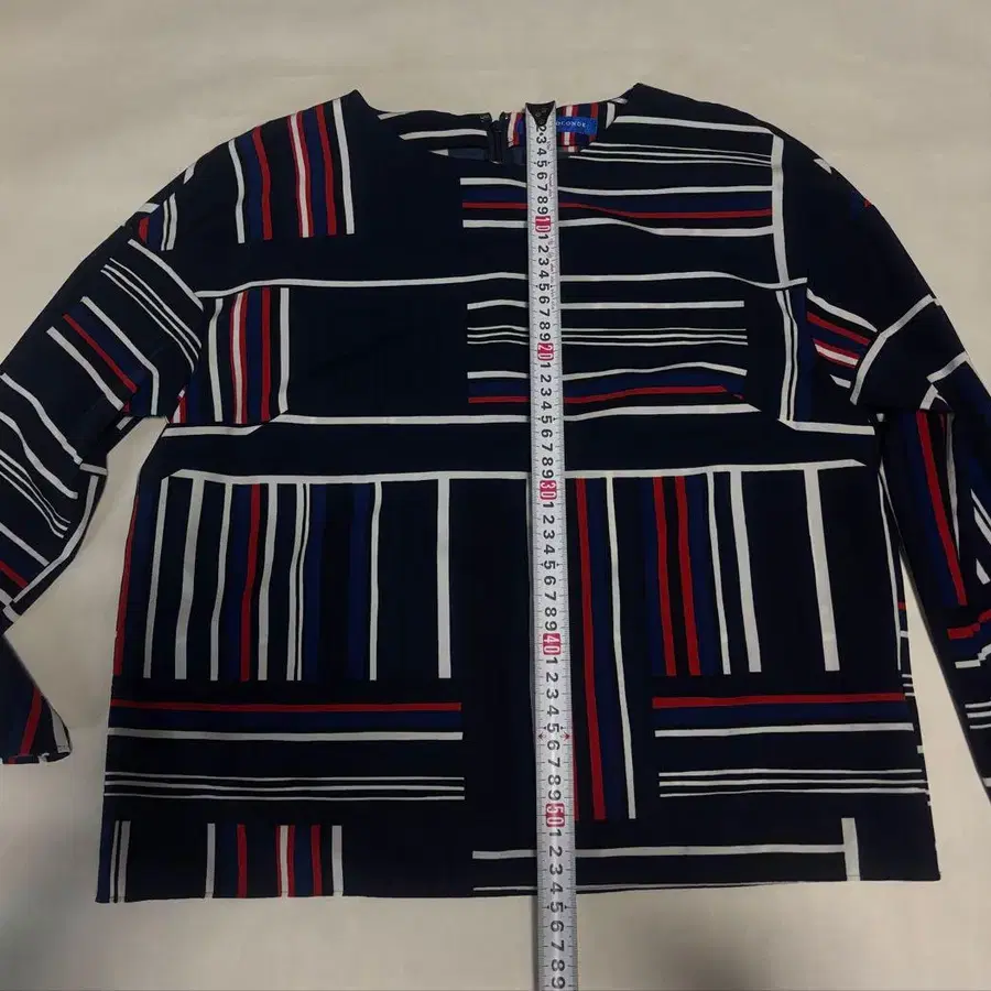 라 자콘다의 네이비 블라우스입니다. 소매에 장식 버튼이 달려 있습니다. 네이비 부분에도 스트라이프 패턴이 들어가 있습니다. 비침 없음