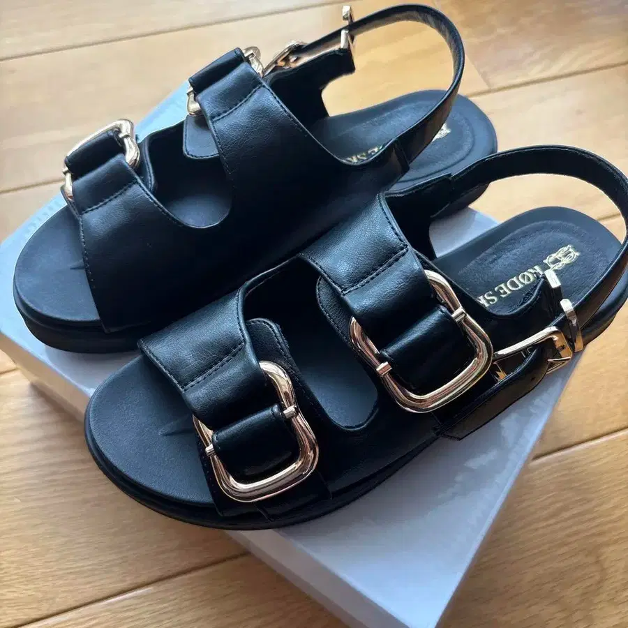 블랙 골드 로고 플랫 샌들
