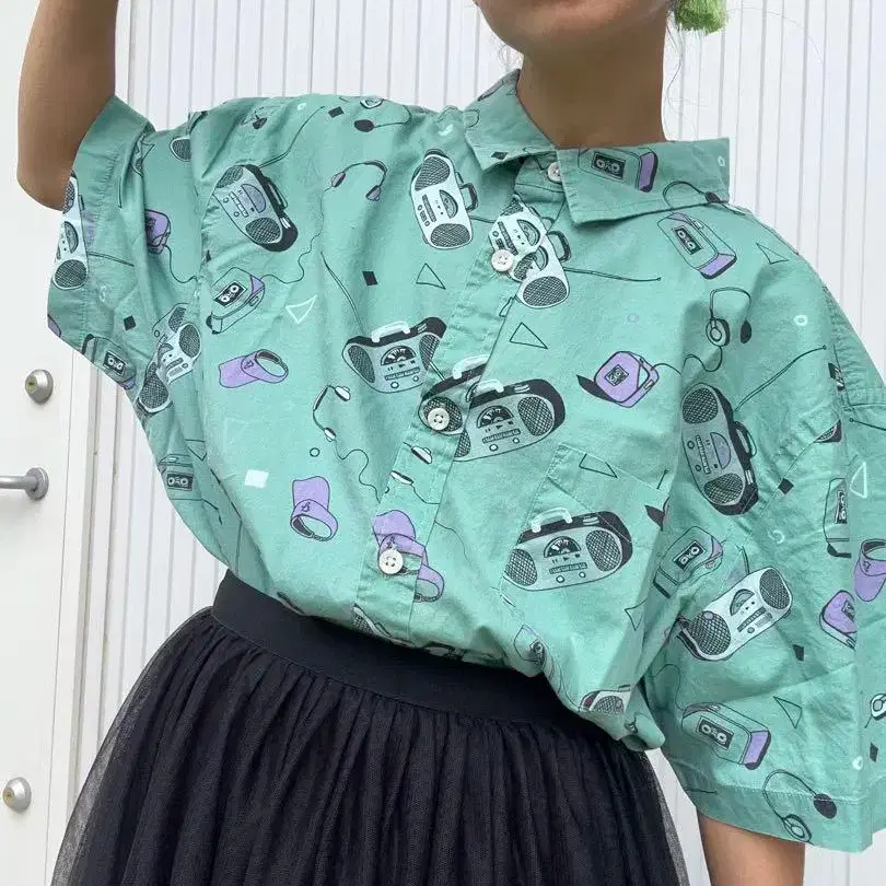 민트 그린 반팔 셔츠 카세트 테이프 프린트