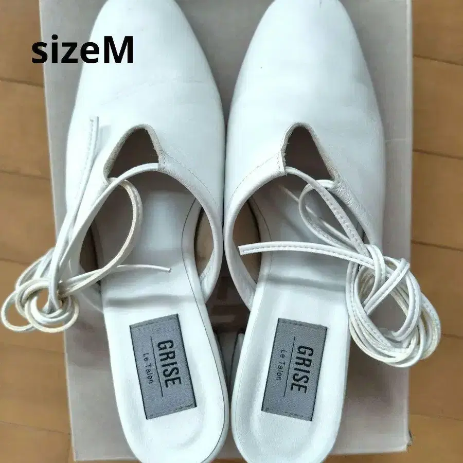 소재: 천연 가죽 몇 번 착용한 새상품급입니다. 스타일리시한 디자인으로 캐주얼부터 포멀까지 폭넓게 활약합니다. - 브랜드: GRISE le talon 루타롱 그리제 - 컬러: 화이트 - 스타일: 뮬 - 힐 높이: 미들 힐 5cm 사이즈 M 이라고 쓰여 있지만, 23cm~24cm 분께 맞을 것 같습니다. 끈을 발목에 감아 발레 슈즈처럼 신을 수 있습니다. 끈이 있어 걸을 때 안정감이 있었습니다.