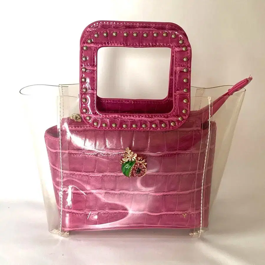 여름에 딱 맞는 파우치 인 백입니다. 주의: 미사용품이지만 비닐 특유의 노후화로 황변이 있습니다. 예민하신 분은 삼가 주시기 바랍니다. 세로 길이 19cm 가로 길이 19cm 바닥 폭 10cm 소재: 소가죽 부속물: 참