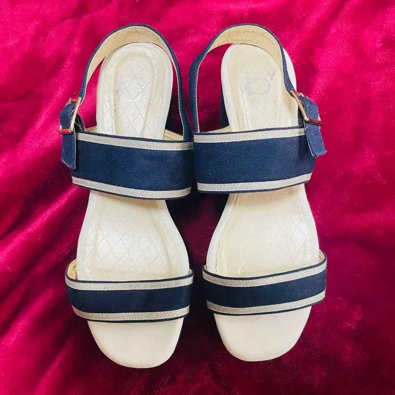 네이비에 화이트 라인이 들어간 통굽 샌들입니다. 색상이나 형태를 봤을 때 캐주얼이나 세미 포멀에도 신을 수 있을 것 같습니다. 데님에 코디하면 예쁠 것 같아서 구매했는데, 신은 것은 짧은 시간 동안 1~2회 정도입니다. 이미지 5번째의 눈에 띄지 않는 데미지가 아주 조금 있지만, 기타는 비교적 좋은 상태라고 생각합니다. 사이즈 LL (24.5~25.0 정도)입니다. #키다리 아저씨 #웨지솔샌들