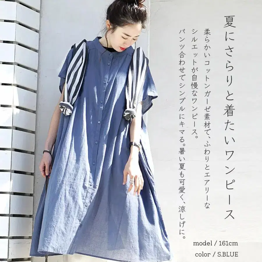 이저카 매니아의 상품입니다. 비침이 있는 부드러운 코튼 거즈의 원피스입니다. 버튼으로 여닫을 수 있으므로 원피스로도 겉옷으로도 사용할 수 있습니다. 포켓이 있습니다. 비침이 있으므로 이너로 착용하시기 바랍니다. 새상품 프리 사이즈 스모키 블루 총길이 약 108cm 가슴둘레 약 184cm 밑단 둘레 약 220cm 암홀 약 48cm 카라 둘레 약 54cm 소매길이 약 40cm 정가 4990엔