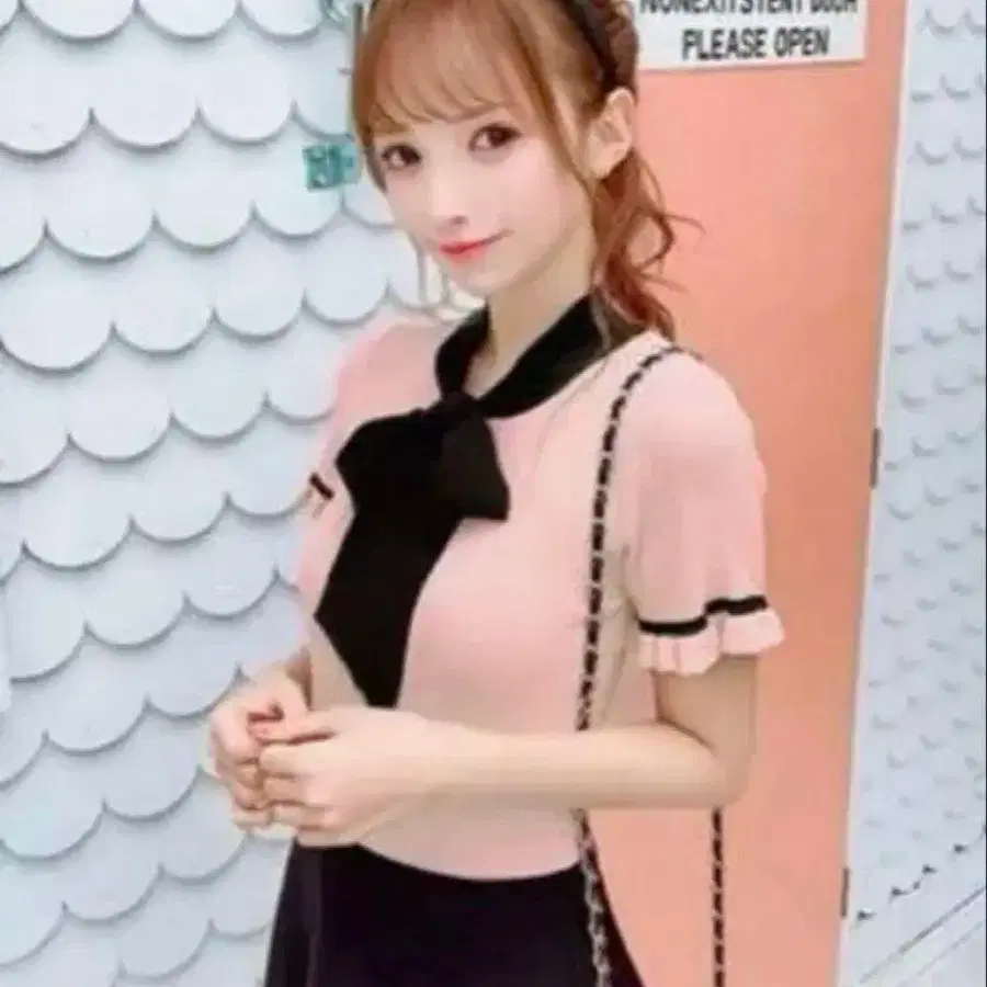 리본 포함 반팔 니트 원피스 미셸 마카롱