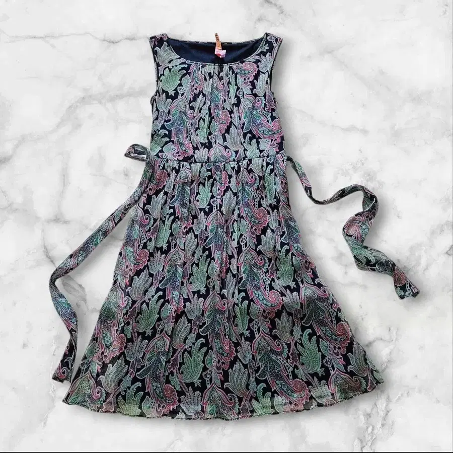 드라이클리닝 완료 ☆★ ANAYI 실크 원피스 리본 끈 포함 양류 쉬폰의 얇고 부드러운 주름 원단이 경쾌한 원피스입니다. 네이비 바탕에 그린, 핑크 등의 페이즐리 무늬에 리본 끈이 달린 성숙/러블리 디자인입니다. 주름이 잘 지지 않아 여행에도 적합 기장(어깨에서 약 96cm) 가슴 너비 약 43cm 리본 끈 177cm 실크 100%