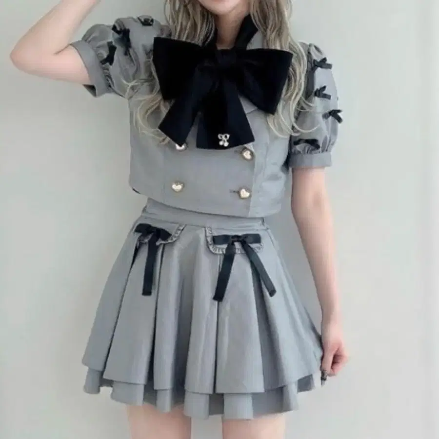 2회 착용 소매 리본 숏 자켓 그레이 정가 16500엔 리본 플레어 치마바지 그레이 정가 12650엔 앙크루즈
