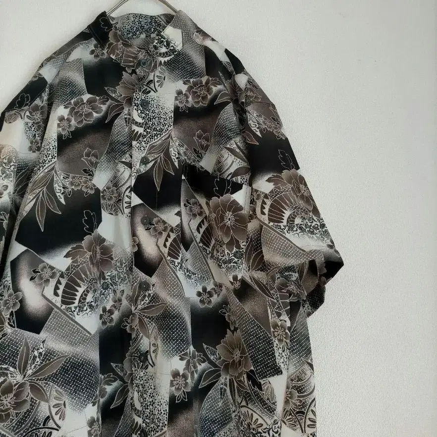 검은색과 흰색의 꽃무늬가 특징적인 일본식 디자인의 반소매 셔츠. - 색상: 검은색과 흰색의 꽃무늬 - 디자인: 일본식 패턴 - 소재: 폴리에스테르 - 스타일: 밴드 카라 셔츠 - 소매 길이: 반소매 방문해 주셔서 감사합니다. 색상...블랙 계열 색상 디자인...밴드 카라/스탠드 카라 얼룩, 찢김, 냄새 등...없음